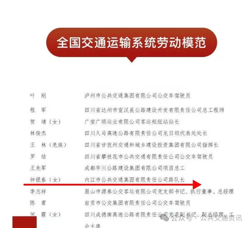 喜报!内江公交路队长钟银春荣获“全国交通运输系统劳动模范”称号