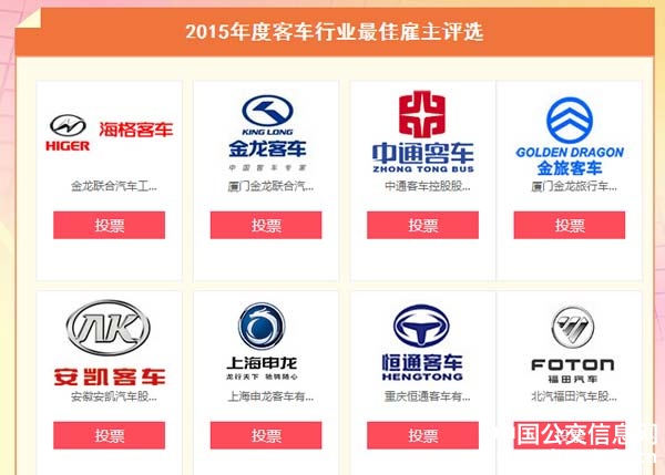 第十届影响中国客车业评选活动将历时一个月,主要通过中国客车网年度网上调查的方式进行,评选活动的结果将会在2015年12月18日举办的‘第十届影响中国客车业2015-2016年度中国客车网读者调查评选结果公布暨颁奖盛典’上公布。而2015年,“中国客车行业最佳雇主”奖项最终将花落谁家?且让我们拭目以待!