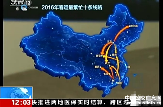从图中可看出,2016年春运最繁忙路线为北京-哈尔滨、北京-西安、北京-武汉、北京-郑州、广州-武汉、广州-重庆、广州-郑州、广州-长沙、深圳-郑州、上海-西安。