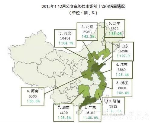 2015年1-12月,公交客车终端市场销售数据显示,广东省销量16162辆,位列第一位,同比增长138.0%;其次是山东、河北、江苏和浙江,分列2-5位,累计销量分别为15296辆、10454辆、8869辆和6800辆;前十省份中,福建累计同比增长144.2%,增幅最大。