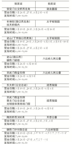 清明节期间,为方便广大市民到各墓地陵园进行扫墓祭奠活动,公交集团将在3月19日至4月10日期间,陆续开通由市区直达温泉墓园、太子峪陵园、通惠陵园、八达岭人民公墓、天慈公墓和八达岭陵园6个墓地陵园的13条扫墓专线,前往上述墓地陵园进行扫墓祭奠活动的市民可就近选择乘车地点。其中,最早的扫墓专线将于19日本周六开通运营。