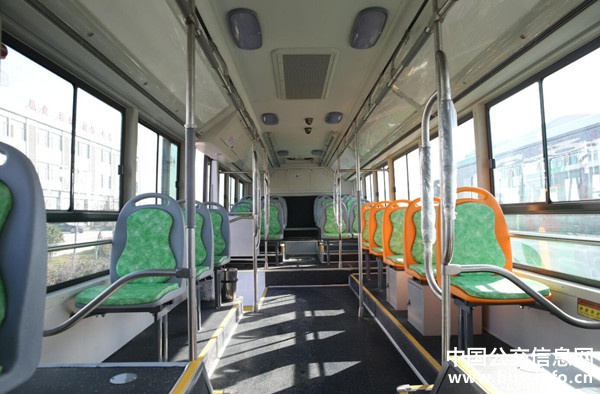 登上车后可以看到,车内饰板主体颜色采用乳白色,软座为灰绿两色搭配;乘客扶手杆为不锈钢材质,且设置更加科学、人性化,方便抓扶。车子启动平稳,运行时听不到发动机噪音。