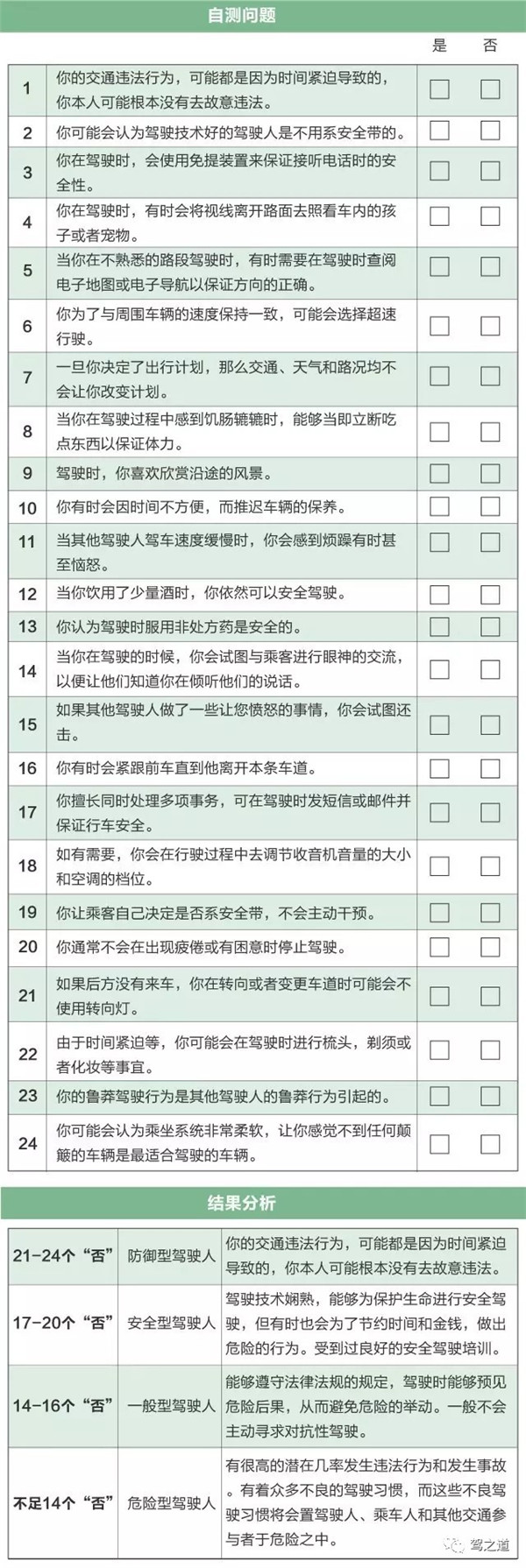 聪明的你不难发现,上面的题目中,选择“否”的个数越多,你的安全驾驶水平就越高,当你有超过20道题都选了“否”,那么恭喜你,你就是一名典型的防御型驾驶员。