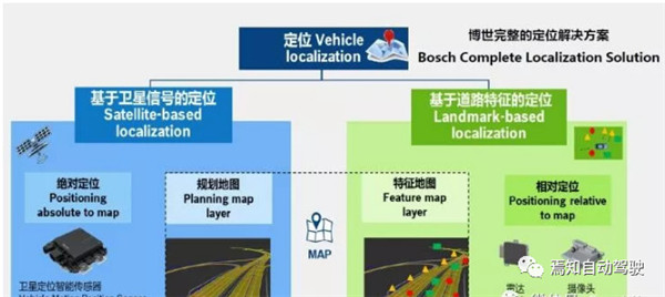 基于卫星的绝对定位:博世开发出了卫星定位智能传感器(VMPS),集成了高精度惯导IMU及信号纠偏服务,能保证多种工况下定位稳定,精度可达20厘米以内。