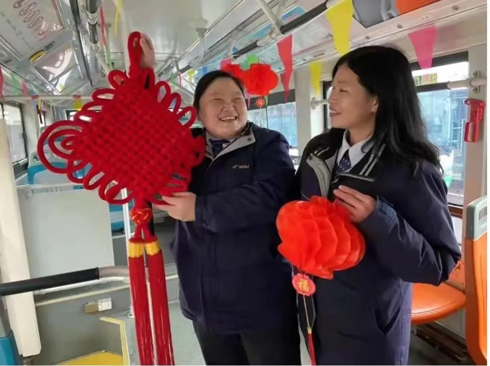 经开公司为迎接新春佳节,除了装扮车厢外,还为沿途乘客送上对联、“福”字,司乘共贺新春佳节。“新年新气象,我们就想给乘客创造一个温馨的乘车环境。”579路驾驶员林红胜说道。为了迎接新的一年,公司各线路驾驶员、线路管理人员自发组织起来对车厢和场站进行装扮,希望节日期间乘客走亲访友时乘坐喜庆、舒适、干净的公交车有一个好心情。