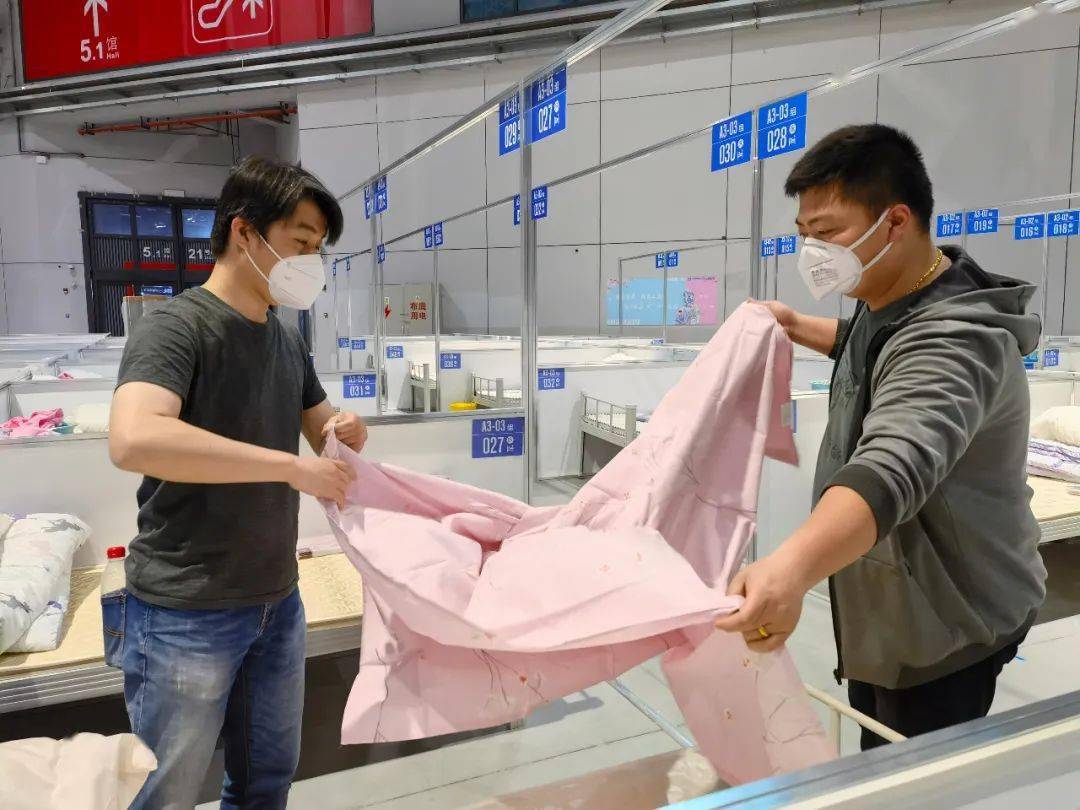 “抖开被子,找清四个被角,同样,也把被套抖开,找准边口方向,将被子与被套重合铺平,四角相对......”国家会展中心场馆内现场,巴士三公司八车队调度员杨陈彬正向志愿者同伴演示铺被褥技巧。不一会,一个有棱有角的被褥“豆腐干”就出来了,大家纷纷投来赞许的目光。“惭愧惭愧,没来这里之前,我可真是连酱油瓶倒翻都不会关心家事的人,家里大小事情都靠老妈操持,我真是一个家务素人。可现在,我们每天都争分夺秒地为启用做准备,我不能拖进度后腿。所以,我在网上搜索,学习整理技巧,和大家分享。这个不难,多多练习很快能掌握要领。”杨陈彬有些害羞地给伙伴们鼓劲。