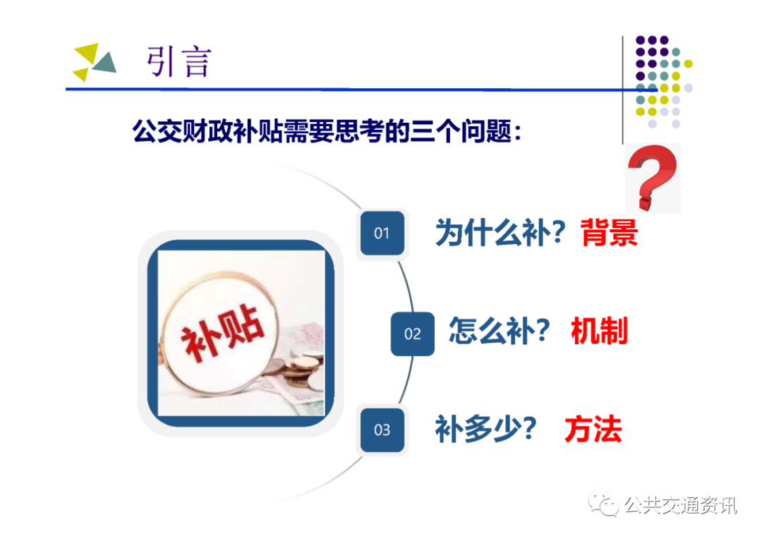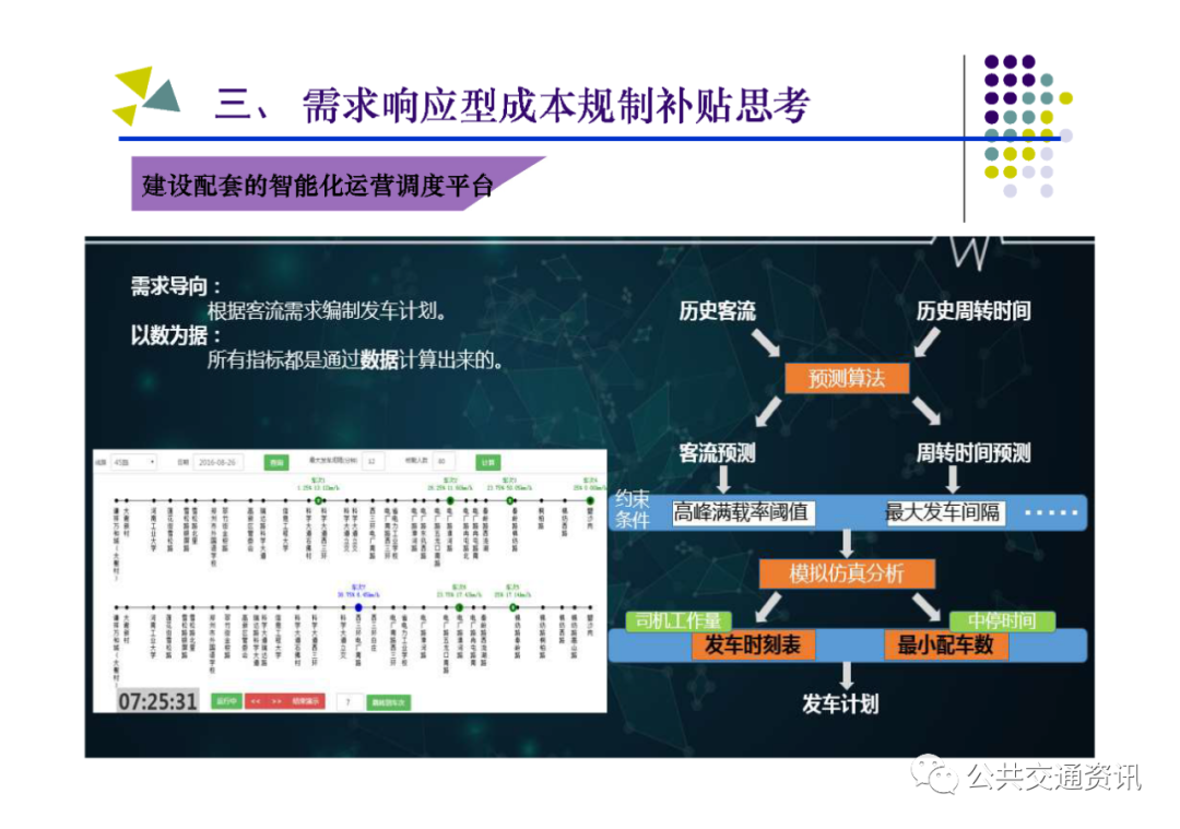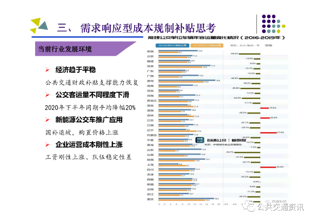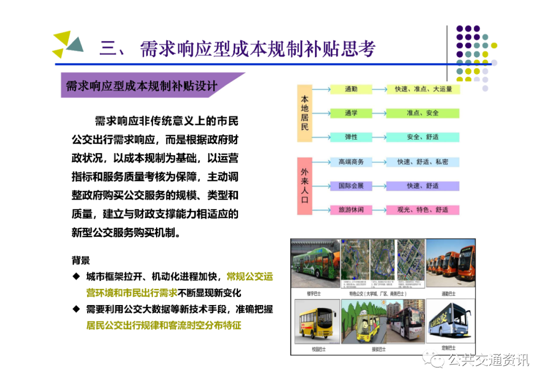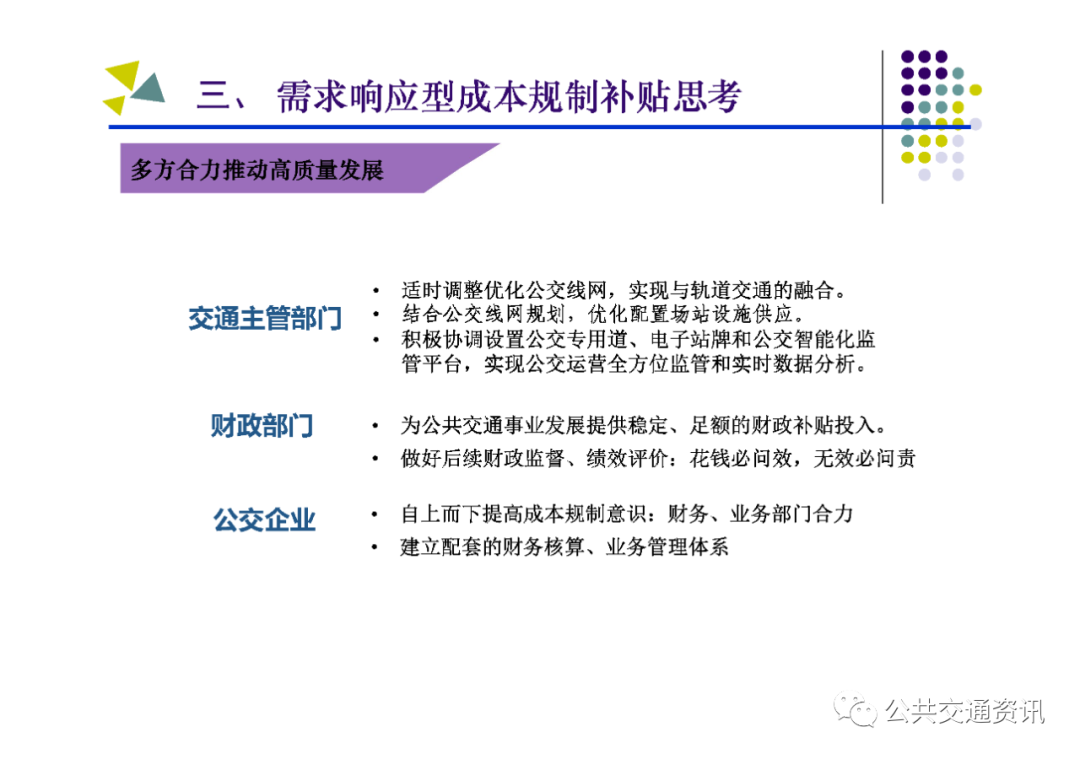 (二)需要把握的关键点:一是对公交需求进行科学管理,区分重点区域、重点线路、重点时段,结合实际制定差异化补贴策略;二是建立配套的监管考核体系,坚持问题导向,按照对标找差、体质增效、实现高质量发展的要求,深化运营指标和服务质量考核;三是建设配套的智能化运营调度平台,以信息化带动行业发展的规范化、标准化、科学化;四是多方合力推动行业高质量发展,财政、国资、交通运输、公安交警及公交运营企业各负其责、各尽其职,才能建设人民满意的公共交通。