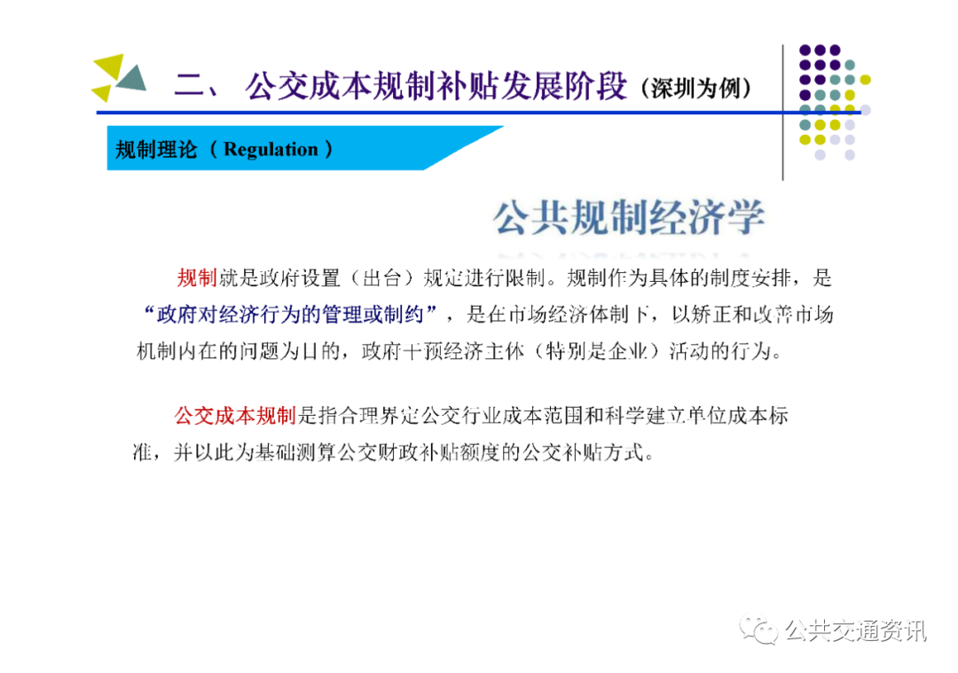 按照公共规制经济学提出,规制是指在市场经济体制下,以矫正和改善市场机制内在的问题为目的,政府干预经济主体(特别是企业)活动的行为。公交成本规制,是指合理界定公交行业成本范围和科学建立单位成本标准,并以此为基础测算公交财政补贴额度的公交补贴方式。