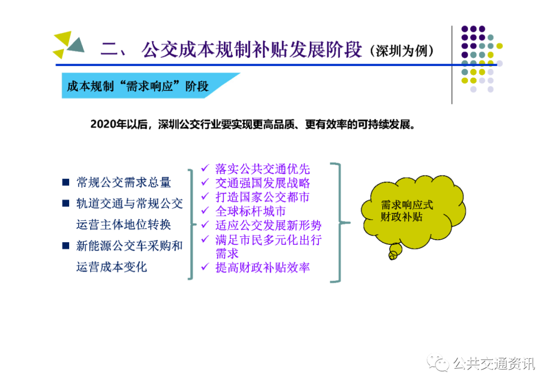 一是成本规制补贴阶段:2008年2月,深圳市为解决公交行业企业主体多、票价偏高、公交服务覆盖不足、城乡客运二元发展等问题,出台《深圳市公交财政补贴及成本规制方案》,建立了以成本规制财政补贴政策,公交企业有38家整合为3家,票价下降20%,车辆规模和线网覆盖率明显提高,冷僻线路陆续开设,公交服务保障能力迅速提升。