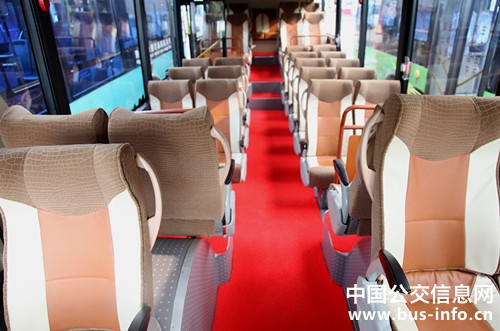 别以为“苏州好行”只有古意,她内在的时髦和科技感绝对不输于外观。走进车厢,呈现在眼前的仿佛是飞机头等舱。车厢内颜色搭配是以米色、淡棕为主的木质色系,温馨耐看。不同于普通巴士的塑料座椅,“苏州好行”的座椅是皮与绒布拼接而成的沙发座,乘坐感舒适而又优雅。走向车厢尾端,设计师还贴心地设置了一个半环形长条沙发区域,对于全家出行或好友相聚的旅客而言必定是极好的。车厢内顶两侧空调风道灯箱饰有苏州代表性景区彩照,可在需要时转换为车辆运行线路牌,灯箱和司机座位背后的玻璃板四角用金属镶嵌出了苏州古典窗棂的花样,尽显吴韵姑苏元素。