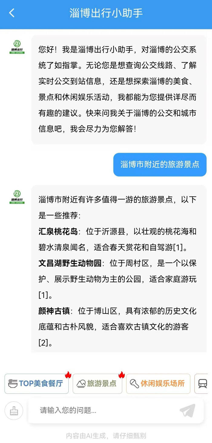 据了解,“淄博出行”APP接入DeepSeek后,用户不仅能够享受到精准的路线规划和实时公交信息,还能在APP中凭借其智能算法,根据用户的喜好和当前位置,智能推荐附近最适合的餐饮、娱乐、休闲场所,极大提升了用户的出行体验。此外,其中还引入了“AI+城市人文历史”功能,带领用户深入探索淄博的文化底蕴。