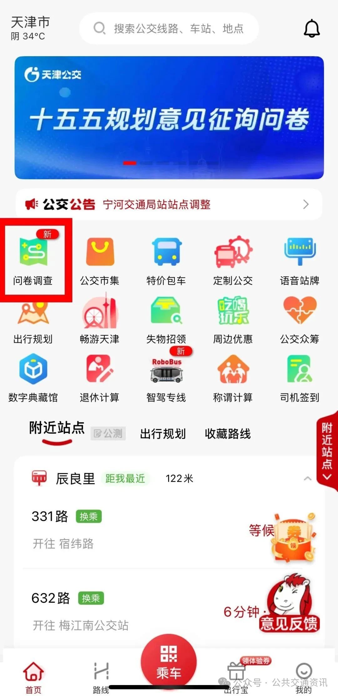 为科学编制天津市公交集团第十五个五年发展规划,精准把握广大市民乘客对公交发展的期盼、诉求与建议,进一步提升规划编制的透明度和公众参与度,即日起至2025年11月30日,天津市公交集团面向全社会公开征集“十五五”规划编制相关意见。市民乘客可登录天津公交APP,点击首页“问卷调查”图标参与问卷填写,并同步提交具体意见建议。