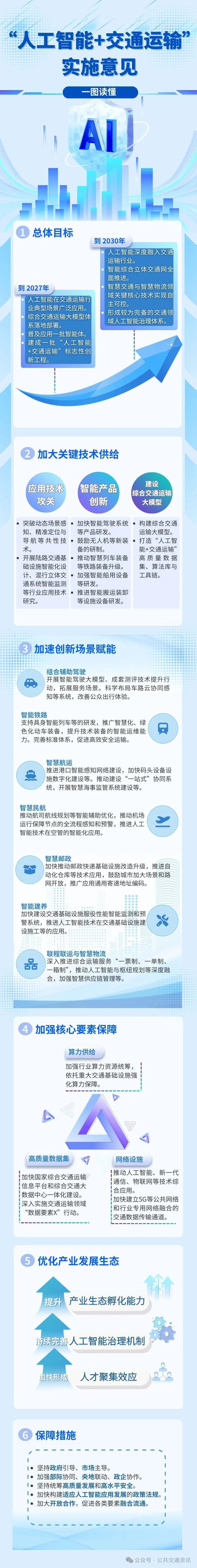 为深入贯彻党中央、国务院关于发展人工智能的决策部署,全面落实《交通强国建设纲要》《国家综合立体交通网规划纲要》和《国务院关于深入实施“人工智能+”行动的意见》,加快推动人工智能在交通运输领域规模化创新应用,现提出如下实施意见。