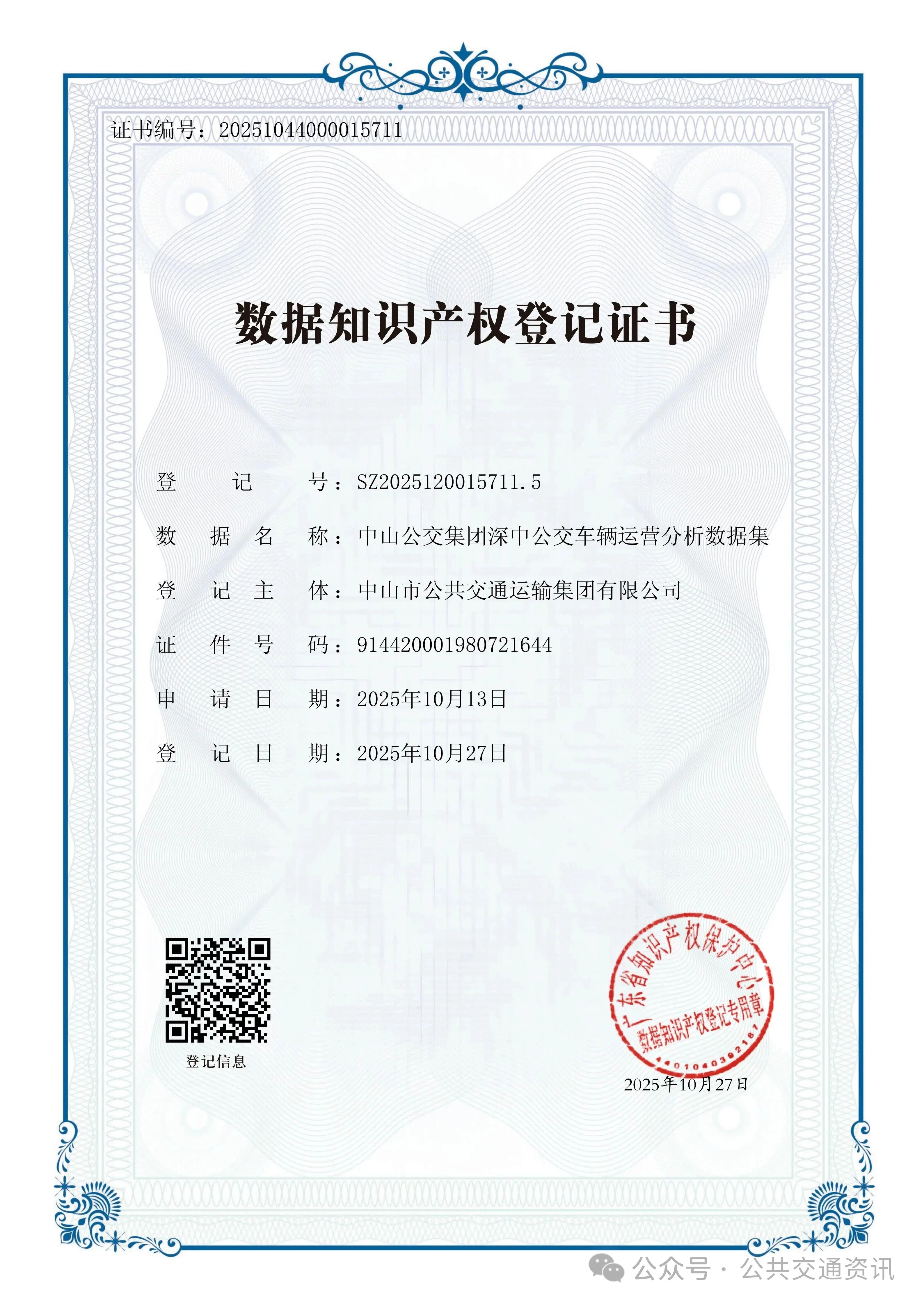 为确保深中跨市公交的准点、舒适与高效,中山公交集团通过整合多源运营数据,形成“深中公交车辆运营分析数据集”,成功构建出行动态调度模型,有效分析深中公交车辆每个班次的发车间隔、乘坐人数和满载率等运营数据,兼具技术创新性与实践价值,该数据集于今年10月获得数据知识产权登记证书。