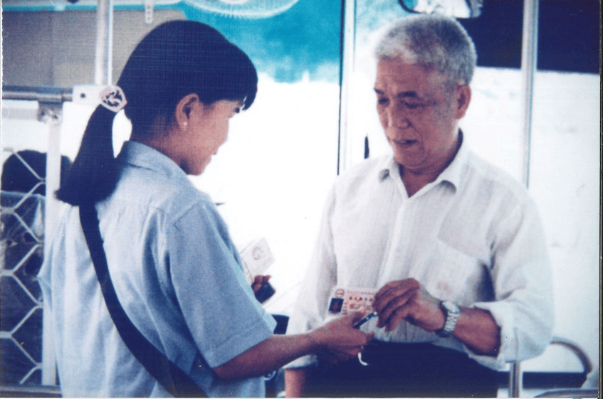1996年2月老年乘客向乘务员出示老年人乘车证,享受免费乘车政策
