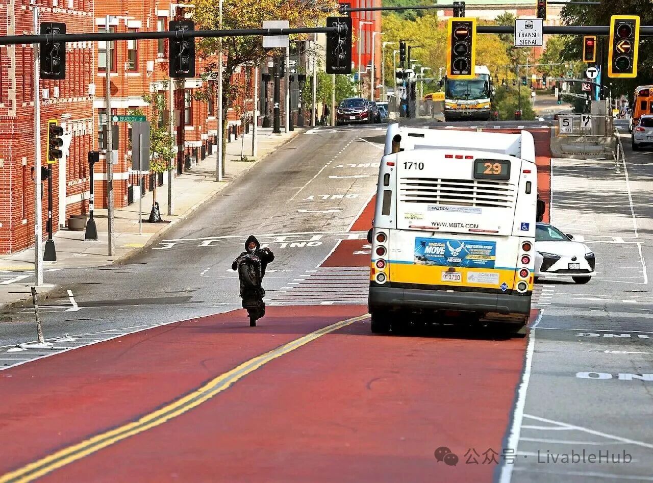 2021年底,美国麻州首府波士顿市在罗克斯伯里的哥伦布大道上线了一项在美国并不算主流、但在交通规划圈颇具争议的设计:道路中央公交专用道(center-running bus lane)。
