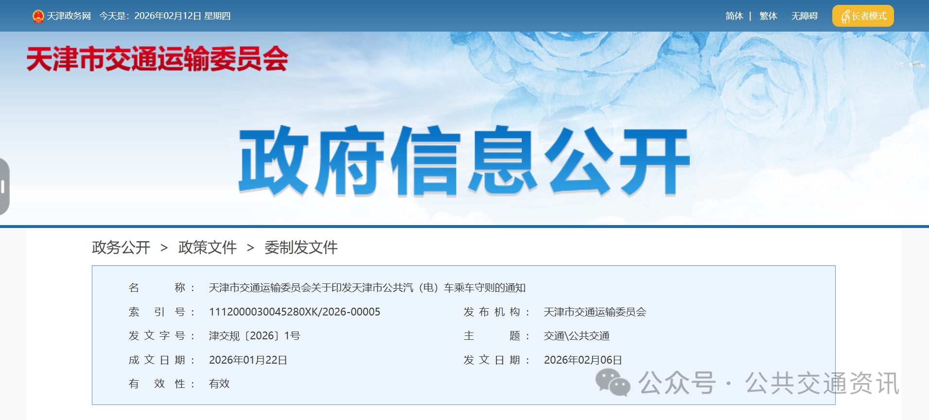 《天津市公共汽(电)车乘车守则》2026年2月16日起施行