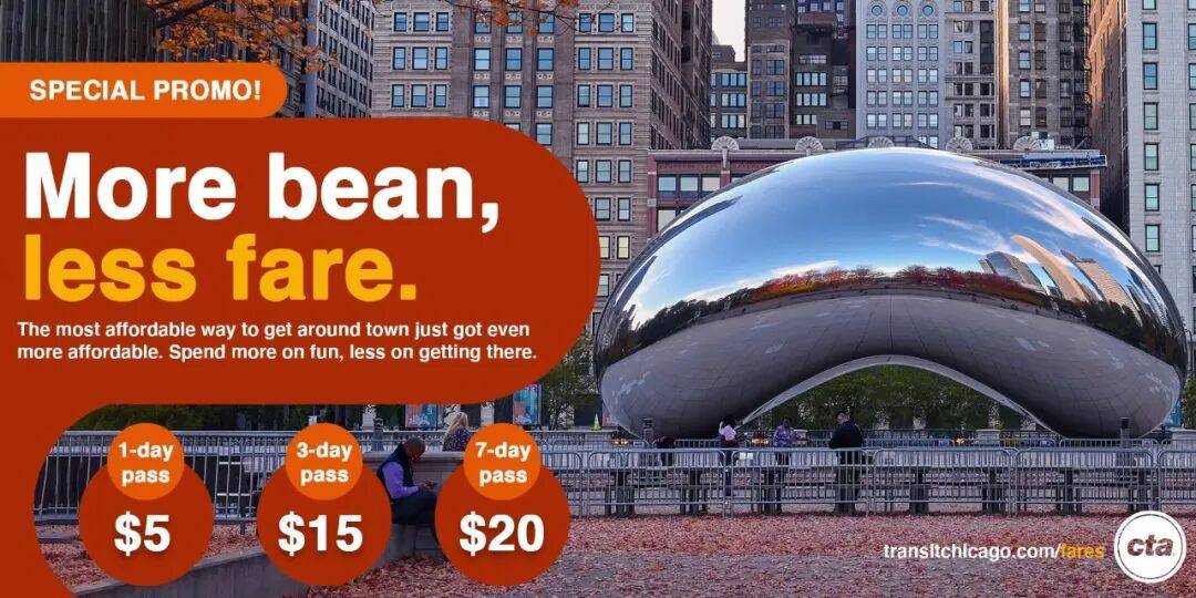 图三、2021年夏季开始的芝加哥公共交通管理局(CTA)广告宣传无限次通行证折扣票价。图:CTA