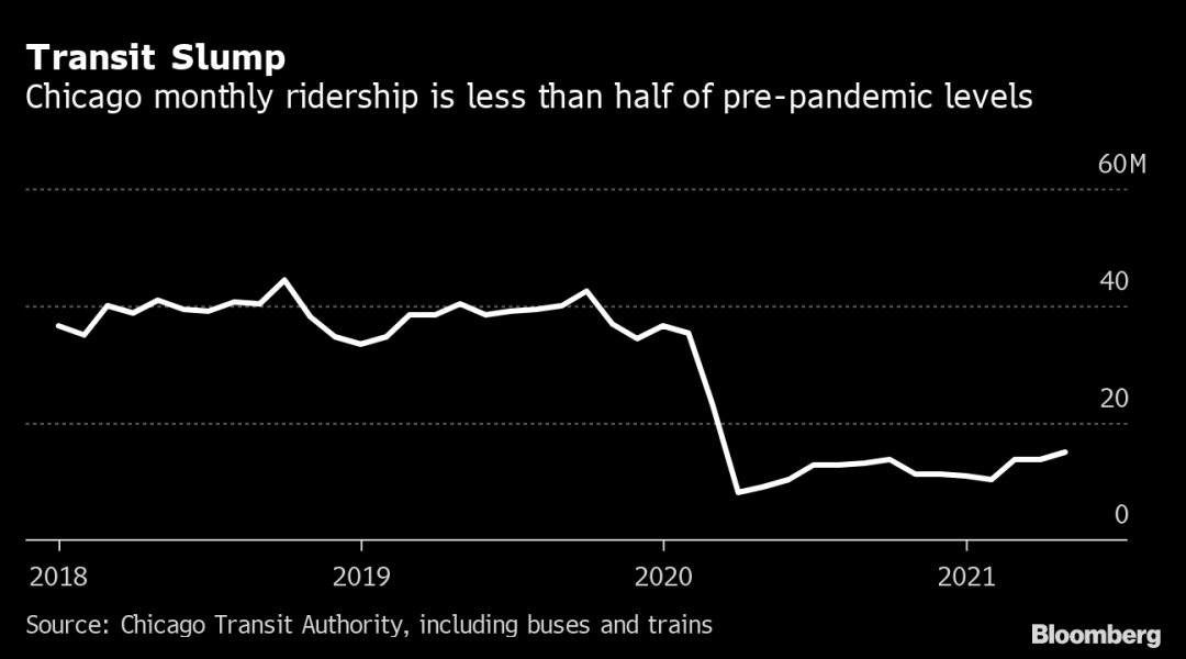 图二、公交乘客量暴跌:芝加哥公交的月均乘客量不到疫情前水平的一半。图:芝加哥公共交通管理局(CTA),公交乘客量包括地面公交和地铁。