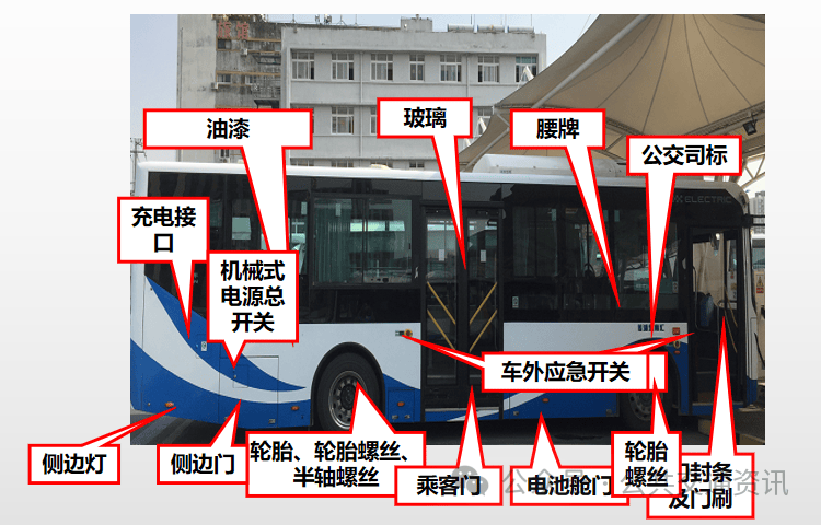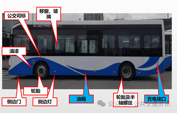 移窗、玻璃、油漆、公交司标、侧边灯、侧边门(锁止有效)、轮胎(气压 光胎)、轮胎螺丝、半轴螺丝、燃油箱及油箱盖(燃油客车)、充电接口(纯电动车)等完好。