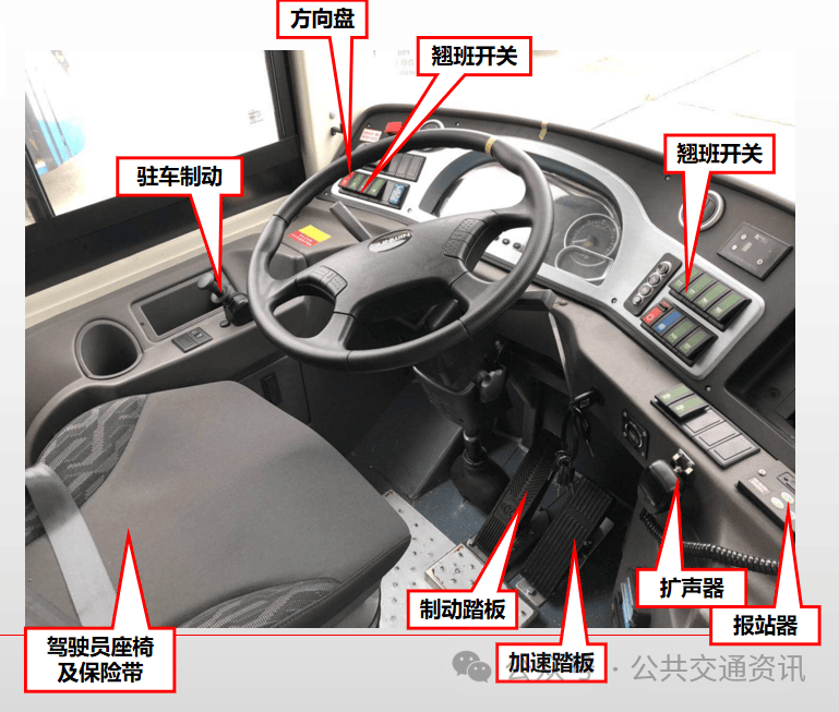 驾驶员座椅、保险带、方向盘、加速踏板、制动踏板、离合器踏板、驻车制动阀及各类开关、电子设备(移动电视、走字屏、报站器、扩音机、电子路牌、POS机、投币机)等设备固定牢靠。