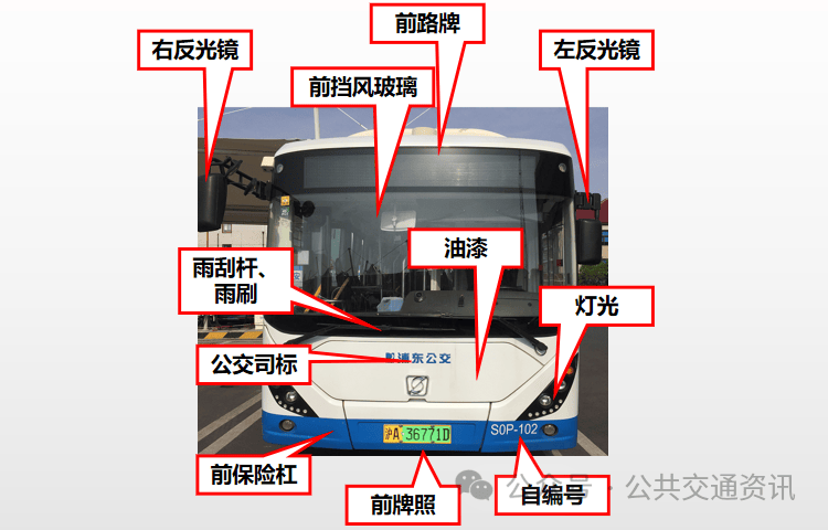左右反光镜及支架、前挡风玻璃、前路牌、油漆、雨刮杆及雨刷、公交司标、灯光(灯罩)、前保险杠、前牌照、自编号等应完好。