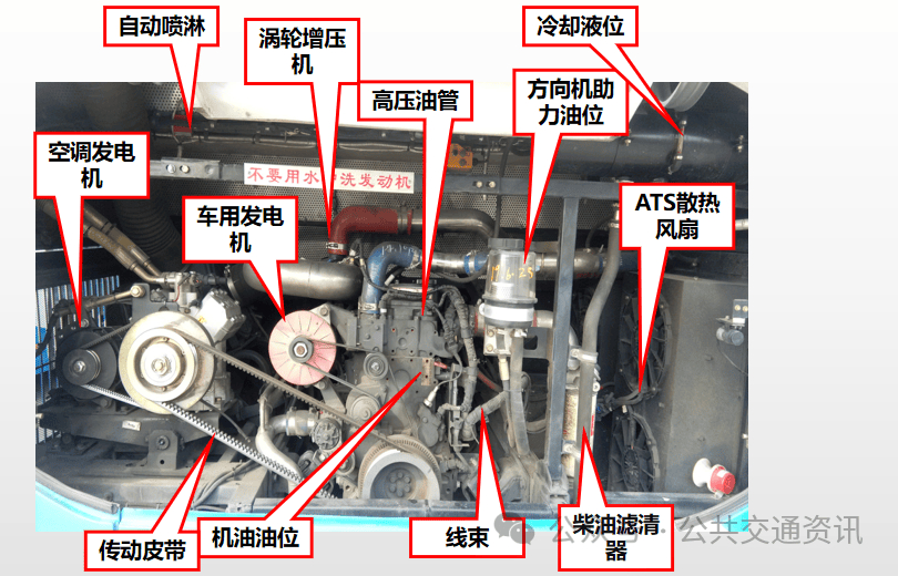 冷却液位、方向助力油位、机油液位、传动皮带、线束、自动喷淋、发电机、高压油管、柴油滤清器、涡轮增压机、ATS散热风扇