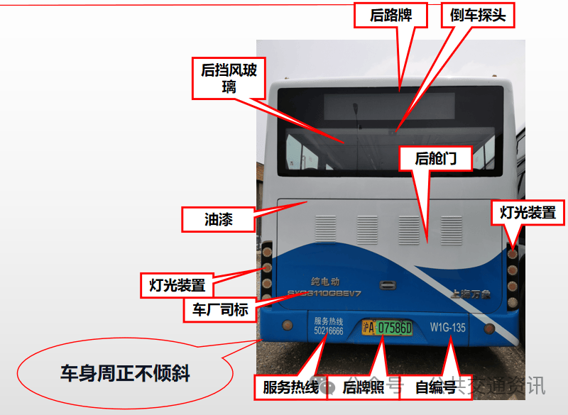 后挡风玻璃、后路牌、倒车探头、油漆、各部灯光装置、车厂司标、服务热线、后牌照、自编号、后舱门、车身周正不倾斜。
