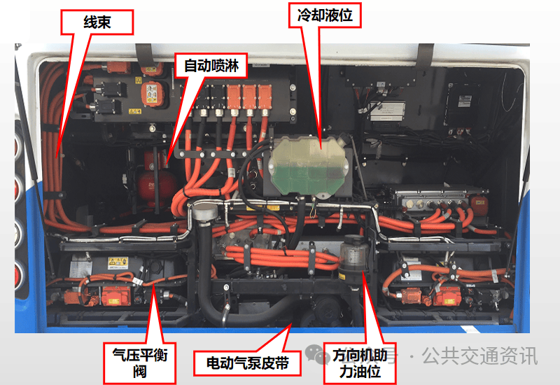 冷却液位、方向助力油位、电动空压机皮带、线束、自动喷淋、电池箱气压平衡阀、各部组件及控制器固定完好。