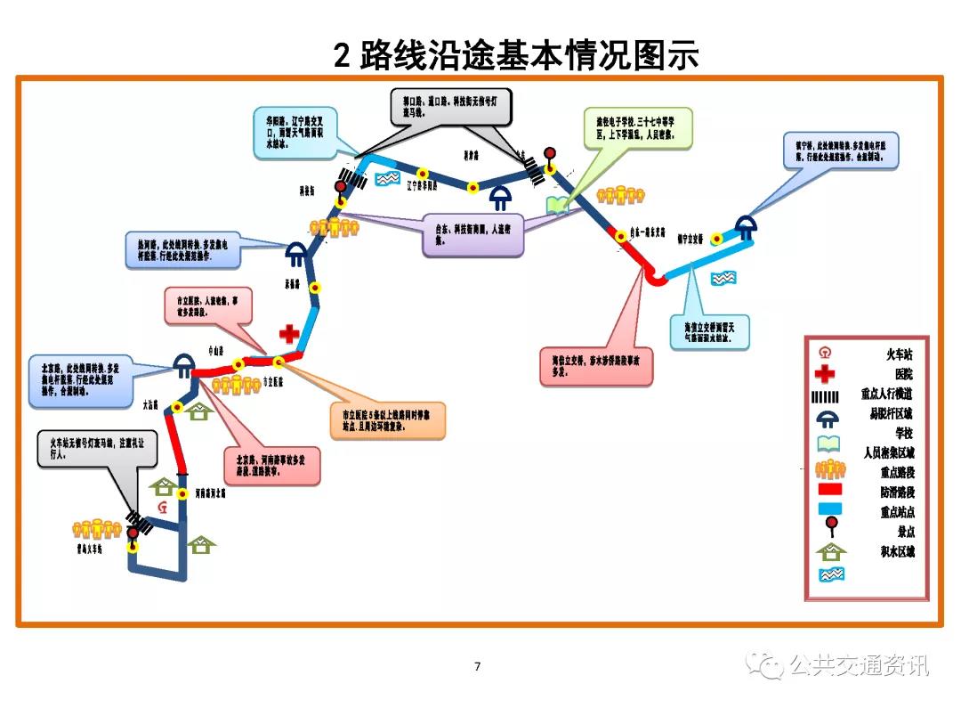 该线路途经路口75处,弯道24个,坡道10个,信号灯43个,斑马线45条,学校2所,集市商圈3个,旅游景点3个,途经枢纽站1个,途经医院1个,人员密集等重要区段4个,涉及同一站点5条线路以上 10 处,重点斑马线 4 处。