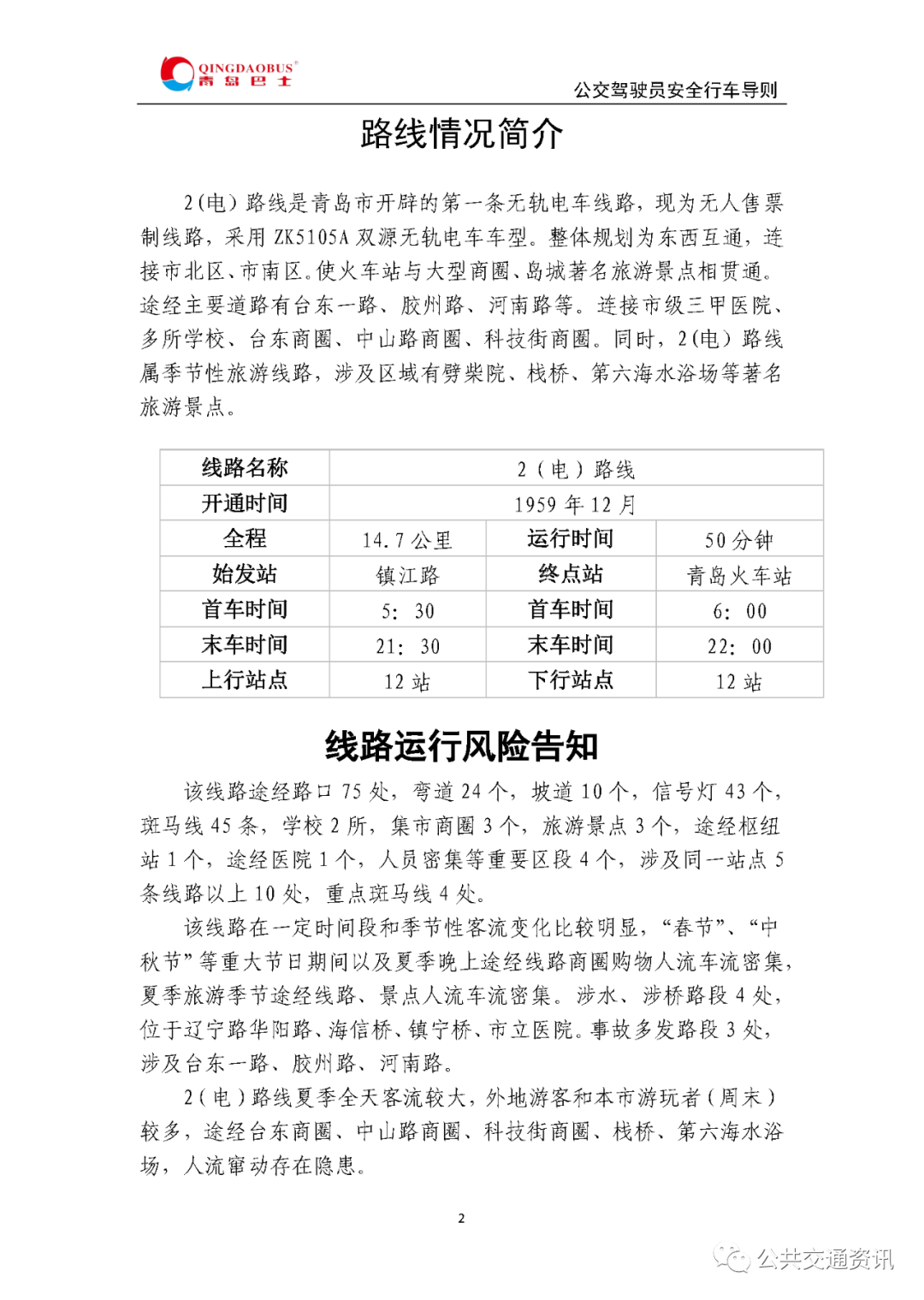 2(电)路线夏季全天客流较大,外地游客和本市游玩者(周末)较多,途经台东商圈、中山路商圈、科技街商圈、栈桥、第六海水浴场,人流窜动存在隐患。