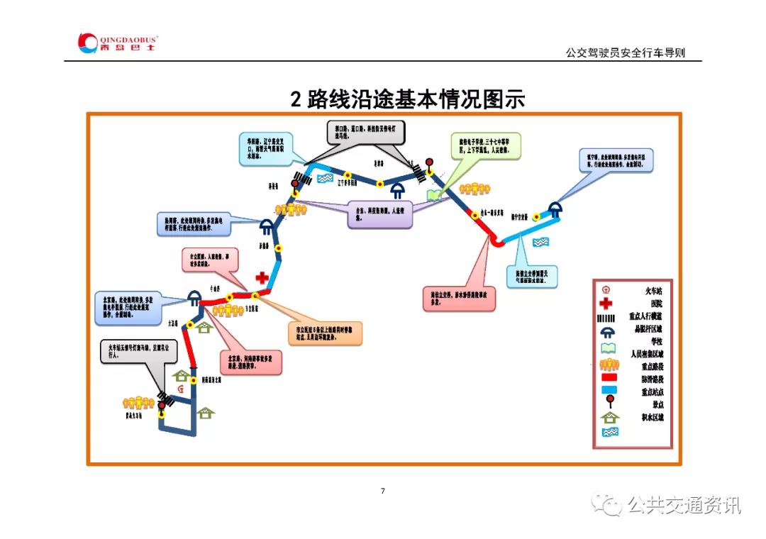 该线路在一定时间段和季节性客流变化比较明显,“春节”、“中秋节”等重大节日期间以及夏季晚上途经线路商圈购物人流车流密集,夏季旅游季节途经线路、景点人流车流密集。涉水、涉桥路段 4处,位于辽宁路华阳路、海信桥、镇宁桥、市立医院。事故多发路段3处, 涉及台东一路、胶州路、河南路。