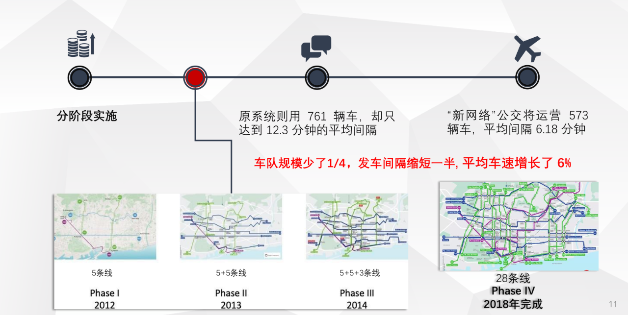 2020年疫情后,全国公交月总量从60多亿急速下滑,目前仅恢复至70%左右。其中,公共汽电车客运量下降幅度最大,恢复速度最慢。未来情况仍不容乐观。从企业角度看,疫情对客运量和营运收入造成了巨大的影响。而公交汽车电动化的增加又进一步增加了企业的建设和运营成本,使得财政缺口进一步扩大。尤其是在国家新能源补贴停止后,地方政府难以及时弥补这一缺口,给企业经营带来了更大的困难。从乘客的角度来看,选择公交出行最关注“门到门的速度”。然而,传统公交规划为了提高公交覆盖率,广布站点,导致频繁的停车延误和较低的“门到门的速度”。传统公交规划还倾向于布设直达线路,提高线网直达率,导致过多线路以及较大的发车间隔。然而,复杂的线路导致客流出现转移问题。短期内,企业应采取自救措施,开源节流。然而,最大的成本来自于车辆和人员的投入,这使得情况变得更为复杂。单纯削减线路可能导致客流量进一步下降,同时也会影响到与政府的关系。因此,公共交通未来发展的长久之计在于提高服务水平、降低成本,以增加客流量。巴塞罗那是西班牙的第二大城市,其人口约为160万,面积为101.9平方公里。自2012年以来,经过四期调整,巴塞罗那将60多条公交线路精简为28条,包括8条横线、17条纵线和3条对角线。这是人类历史上第一次颠覆性的线路调整实践,完全摒弃了以前的线路设计,重新进行了全面规划。过去线路繁复、车类众多,导致每条线路的车辆无法增加,经济成本限制明显,导致间隔时间长、频率低、换乘不便等问题。新的方案将线路总体规模缩小,每条线路的车辆更加频繁。巴塞罗那在换乘方面投入了大量工作,以确保乘客换乘更加便捷。这是巴塞罗那公交新方案的基本特点。经过2012年至2018年的六年建设,车队规模减少了25%,发车间隔减少一半,平均车速提高6%。从车辆运行角度看,这些指标表现良好。然而,客流和经济效益如何呢?在换乘点,虽然线路加大了站间距导致走行时间增加,但线路运行的速度远远超过了走行时间的牺牲。此外,对换乘设施的设计和引导也进行了深入的研究和优化,使换乘时间减少了25%。