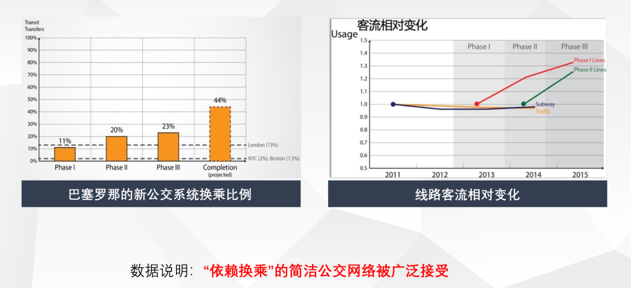 左侧图表展示了巴塞罗那公交的换乘率从PhaseⅠ的11%逐步提高到20%、23%、44%,这一成就在传统公交系统中难以想象,足以与地铁相媲美。右侧图表描绘了规划客流变化图,随着各期公交线路的建设,前期线路的客流量不断上升,意味着新线路的开通吸引了更多的换乘乘客来到原有公交线路。巴塞罗那的公交线路设计依赖于换乘,呈现出非常简洁的特点。