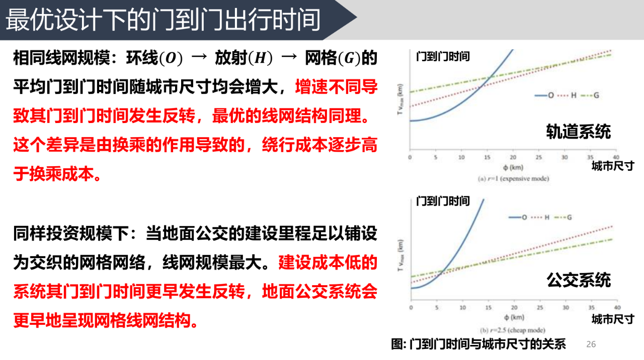 回顾全球公交发展的历史,70年代的BRT是一次技术驱动的变革,依赖于低底板车辆、专用路权和车外检票等技术。然而,巴塞罗那的公交变革并未依赖新技术,而是基于整个公交运行和规划运营理论的变革,涉及线网设计、运营设计和实时控制理论。1、从第一性原理出发,需要重新审视城市发展和公共交通之间的关系。通过物理尺度分析,在现代城市化进程中,以小汽车模式为主导的交通方式会导致交通需求的增长速度达到交通供给的2倍。换言之,如果只依赖小汽车来满足交通需求,那么随着城市的人口密度和尺寸的增加,高峰通勤时间也会相应地增加。城市发展受到能源、水和交通等要素的限制。如果北京没有公交系统,其最大直径长度在最理想的情况下不会超过75公里。这意味着,如果城市想要继续扩大其规模,必须依赖于公共交通系统来满足日益增长的交通需求。上述结论与小汽车技术无关,未来无论是自动驾驶时代、智能网联车时代,城市的发展都离不开公共交通系统的支撑。公交出行时间由在程时间和步行时间组成,两者都与站间距有关。优化这两者可实现公交运行的最优速度,通常比自行车稍快,但无法满足城市服务需求。因此引入干线和支线的层级结构,支线可采用多种出行方式,主线则拉长站间距。这种结构下,公交系统的“门到门时间”接近小汽车出行时间。理论上,每个公交运行方式应像蜈蚣一样由干线和支线构成,否则其将是低速、低效的运行方式。3、公交优化的线网结构理论,揭示换乘安排的重要性。通过理论推导,证明了平均“门到门时间”与城市规模和线网里程之间的关系。通过对比环线、放射线和网格线三种不同的公交线网结构,随着城市尺寸的增大,“门到门时间”也在增加,但增长速度各不相同。环线的绕行成本随着城市尺寸的增加而急剧上升,而换乘可以为我们带来便利,解决“门到门时间”。因此,理论上讲,通过优化公交线网结构和换乘安排,我们可以实现更高效的公交服务。在相同的投资规模下,地面公交的建设里程显然远大于轨道交通,其线网规模更大。因此,地面公交线网结构发生反转的时间更早,这表明我们应该更早地利用基于换乘的线网。然而,这是传统公交线网设计的基本方法吗?事实上并非如此。当我们知道换乘安排的重要性以后,就需要制定好时刻表,以便乘客能够便捷地进行无缝的换乘。同时,时刻表的制定还需要考虑到如何应对公交的正反馈效应,如何避免串车等问题,并采用不同的控制方法来解决这些问题。从理论上讲,公交系统不需要担心未来的自动驾驶对其造成影响,因为公交系统作为城市交通的主干,其地位是稳固的。单线运行必须通过层级结构才能提高“门到门的速度”。当城市规模增大时,我们通过线网换乘来解决效率问题。实际上,公交的换乘比地铁更容易实现,但在实践中我们可能走在了错误的方向。从规划到运营,我们需要更好地协同制定时刻表和进行车辆控制。