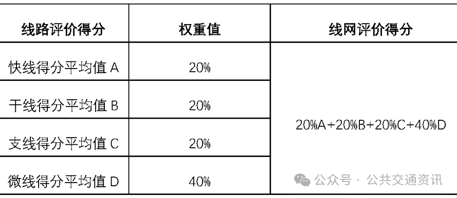 结合公交线网片区化规划思路,将片区线路逐条评价打分后,按照一定权重值计算,获得片区线网整体评价情况。