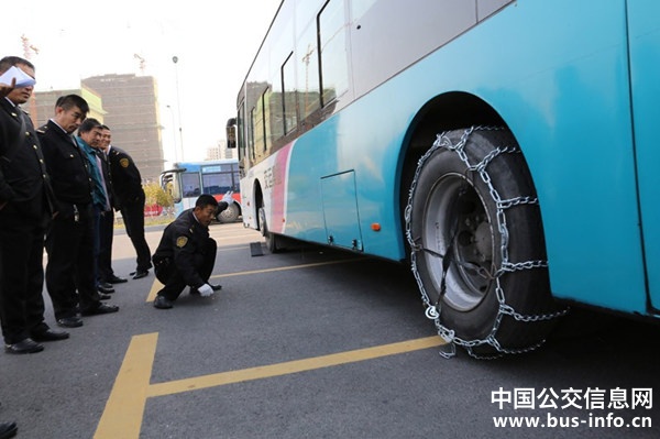 截至目前,交运温馨巴士已经备好4000多套防滑链条、100余吨融雪剂、4000辆公交车每车一个掩木和400多吨防滑沙等物资,来应对雨雪天气。