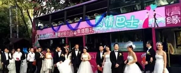 2015年11月28 日下午14点,在亲朋好友和热心市民的注目与祝福掌声中,来自厦门银行漳州、厦门、龙岩、南平、宁德等各地分行的20对新人携手踏上厦门特运交通国旅双层环岛观光巴士,彼此见证人生中最幸福、最难忘的一天。