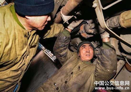 1月9日,赵国辉(右)与邱宝诚在对一台车辆进行修理维护。刚刚进入“三九”,吉林省平均气温低至零下17摄氏度。在长春公交集团北达汽车公司雁鸣湖公交枢纽站,机务队的修理工也进入一年中最忙碌的时候,默默无闻地保障着公交车辆的冬季安稳运行。北达公司机务队有修理工30多人,负责179台公交车的维修保养工作。邱宝诚和赵国辉是队中经验最丰富的成员,有30多年的维修经验,是大家公认的师傅。