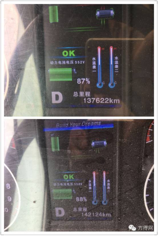 2辆502路车跑完40公里后的剩余电量值,上面还有车辆行驶总里程数据