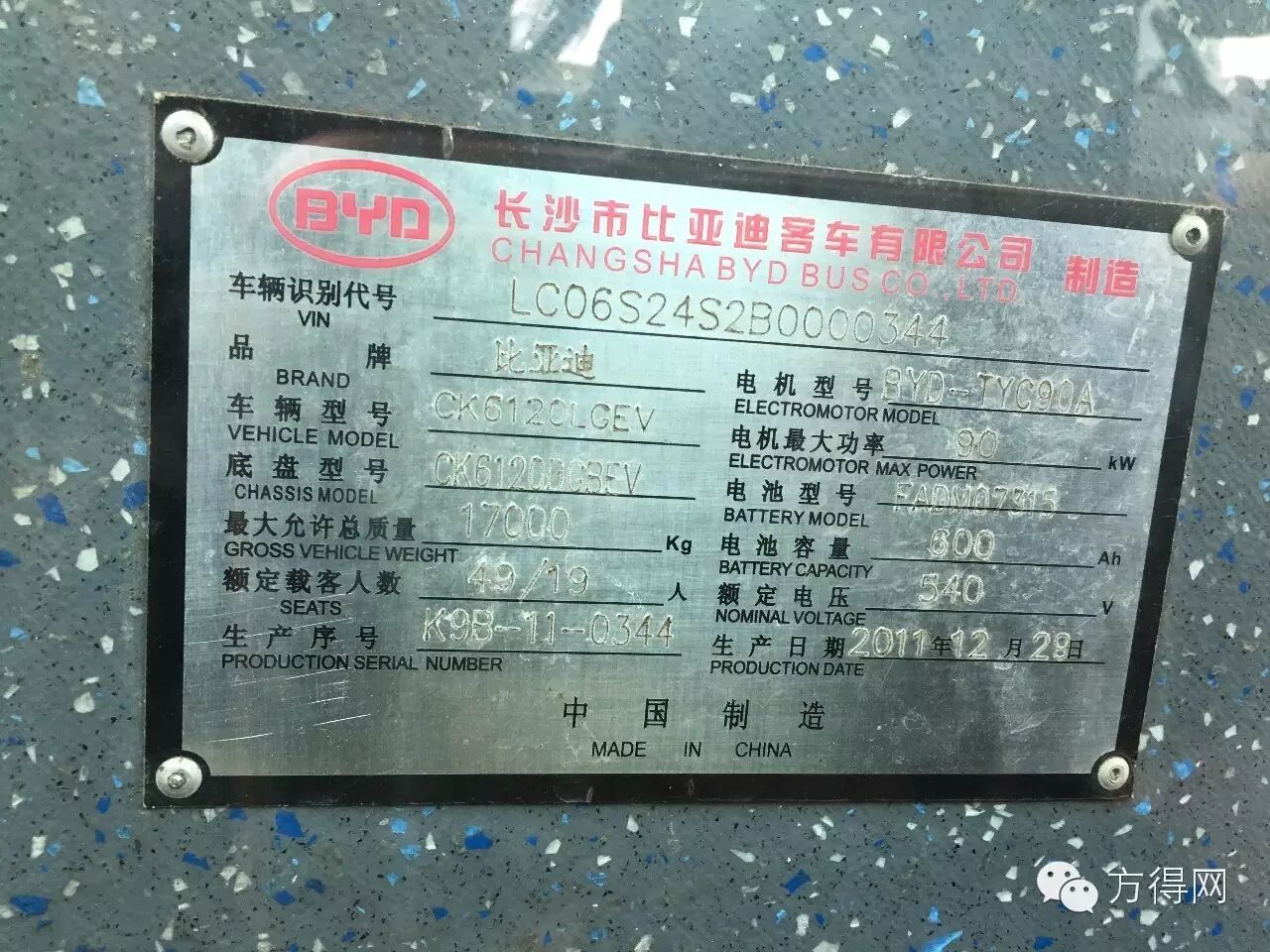 车内有比亚迪K9技术参数的铭牌