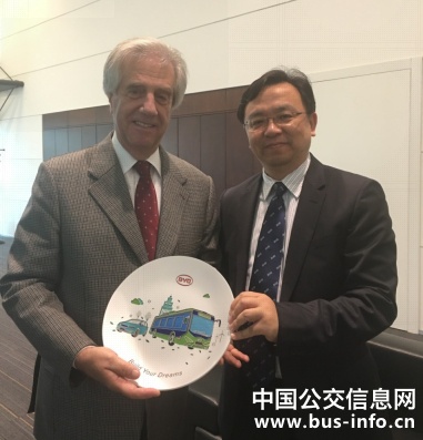 又有一场绿色交通改革的盛会,比亚迪掌舵人王传福获邀出席,现任乌拉圭总统巴斯克斯再次与比亚迪相聚,在总统的见证下,乌拉圭第一台纯电动大巴将正式在其首都蒙得维的亚市扬帆起航。总统巴斯克斯迫不及待地作为首批乘客率先体验并为此次活动剪彩,为比亚迪纯电动大巴的正式运营保驾护航。