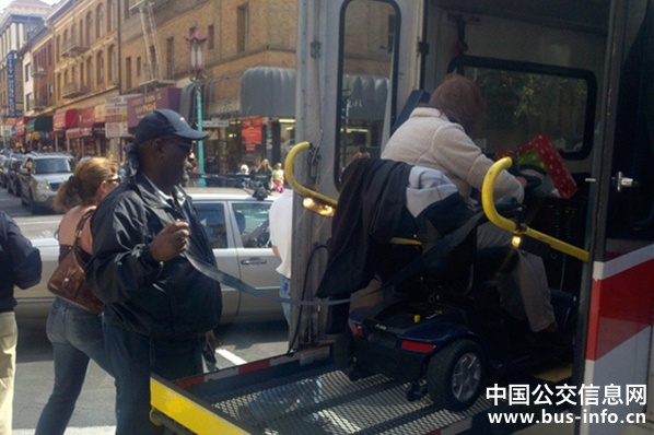 美国的公车都是无人售票的,一辆公车就司机一人。只有两个门,都是在前门上。司机旁边有个买票箱,一张车票在10美分到2.5美元不等,主要是根据你所在的地方和上下班高峰而定的。美国的公车最人性化的地方是对老人和残疾人。美国的公车都有一个升降装置,在国内旅行的大巴上才偶尔可以看到。在行动不便的老人或乘轮椅的残疾人需要上公车的时候,司机就会把升降板降到和地面水平,等老人或载有残疾人的轮椅上到升降板上后,司机再把板子升起来,这样老人和残疾人不用费力就可以上公车了。上了车后,司机会把车内前放的坐椅翻上去,给轮椅腾出地方,再用专门的链子把轮椅固定住,这样车开起来后就比较安全。等下车的时候,司机再把链子松开,升降板降下来。这样一个来回一般也都要5-6分钟。有时候坐轮椅的残疾人操作不好,总是上不来,耽误的时间可能更多。要是有急事的人可能会等不及。但从来没看过有人因为这和司机或其他的乘客抱怨,大家看起来都很理解。再看看我们国内对残障人士和老人的照顾几乎没有,很少看见坐轮椅的残障人士会选择公交车出行,因为我们的设施不够完善,选择公交车也不会给他们带来方便,没有办法让他们独立自由的出行。