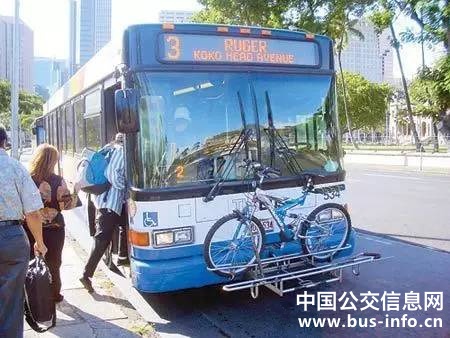①:美国的公共汽车前面都有一个自行车架,可以放两辆自行车。经常看到有人推着自行车等车,汽车来了,就径自将自行车放到架子上,然后上车。