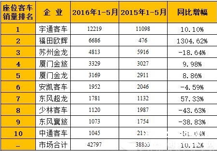 2016年,宇通客车依然稳坐热销冠军宝座,今年1-5月累计销售5米以上客车2.33万辆,同比增长24.29%,销量继续排名行业第一,累计增幅排名行业第三。排名保持不变的,还有中通客车和安凯客车,分别位居第3名和第7名,销量增幅分别为43.8%和10.06%。