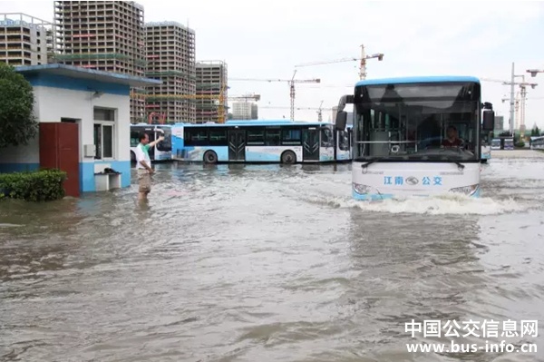 7月7日凌晨4点江南公交安全部管理人员奔赴受灾最严重的沙洲地段进行抢险工作,并通过微信、QQ群及时与分公司保持密切联系,针对分公司反馈的汛情及时到现场勘察,疏导交通。车队安管干部全部到岗,担负起道路探路,抢险工作。凌晨5点30分,江南公交总经理张宏滨在微信工作群中下达了工作指示,公司相关部门和各分公司严格按照防汛工作预案,对已经和可能出现的险情采取措施加以应对。公司领导班子赶往现场进行督导,车队及时启动应急预案,各自到达制定安全岗,确保行车安全。7点26分接到地铁1号线天隆寺站淹水断行的信息后,7点40分安排第四巴士公司车辆在张府园至安德门站进行接驳,9点30分安排车辆进行接地铁驳路线的探路准备工作,11点10分完成与地铁1号线南京南站北广场-大明路4辆车和安德门到三元巷站6辆车接驳;与地铁3号线大明路到南京南站5辆车接驳工作。