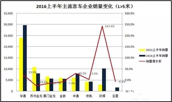 2016上半年,国内5米以上客车以10.5万辆销量迅速回暖,同比去年同期增长13.7%,市场向好趋势明显。整体回暖态势中,各家主流客车企业市场表现又如何?谁涨谁跌?市场格局又有什么变化?