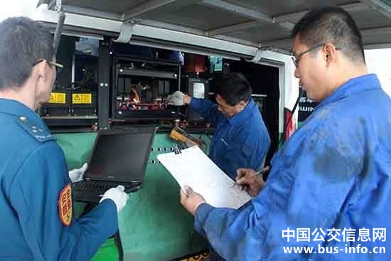 记者来到公交集团深圳路车队,在一层停车场看到,两部纯电动公交车正在同时进行安全检测。一部501路公交车旁边,一名技术人员正在用电脑检测转向助力控制器。在现场检测的技术员张辉说,纯电动公交车价值高,一般都在百万元以上,科技含量也高,许多检测项目靠目测和拆机检查无法完成,需要专门的软件检测,仅仅高压绝缘检测之中就有10个项目要靠电脑软件检测完成。“整个车辆安全系统检测共56项,每项检测完成并进行一级维护后,方能交给车队,”张辉说。
