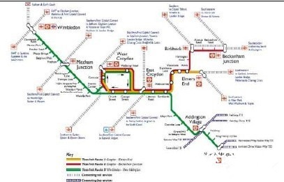 如下图服务于伦敦市的卫星城Croydon的三条有轨电车线路示意图。其中一条线路的起点接驳于地铁District线的终点站,实现城内与伦敦中心城区的联系;3条线路分别连接7个国铁车站,并在2个车站可与多条郊区公交车接驳,整个有轨电车网络中形成了众多中等规模的公交枢纽。