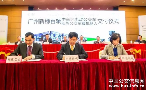交付仪式现场,中车时代电动、广州新穗巴士、广州部落科技签订了三方战略合作协议,旨在共同推进广州市智能绿色公共交通的发展。